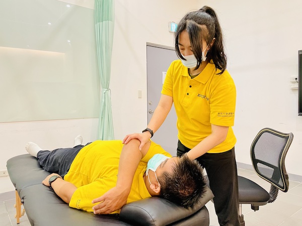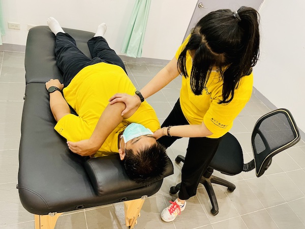 施術者將左手固定對方肩關節的位置,另一隻手放在手肘位置,讓對方掌心微微往後,把對方的手往頭部左方位置靠。