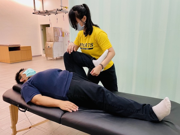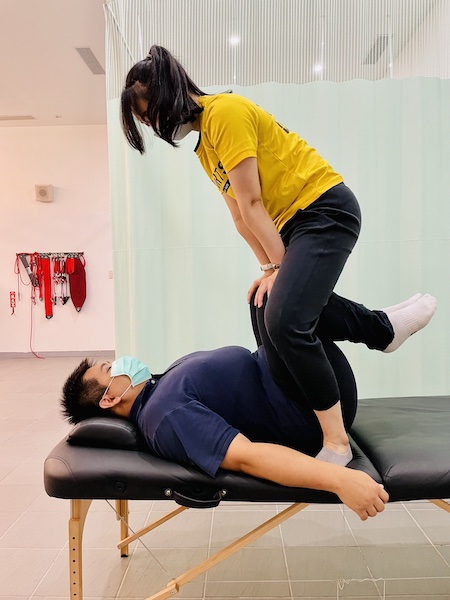 雙腳:先讓對方躺平,把雙腳抬起做出抱膝抬腿的動作。這時候再將力量往下壓。在伸展的過程當中,下背也會一同被牽拉到。如果從事競技運動的人,防護員甚至可以雙腳都坐在腿上,加強下壓力道。