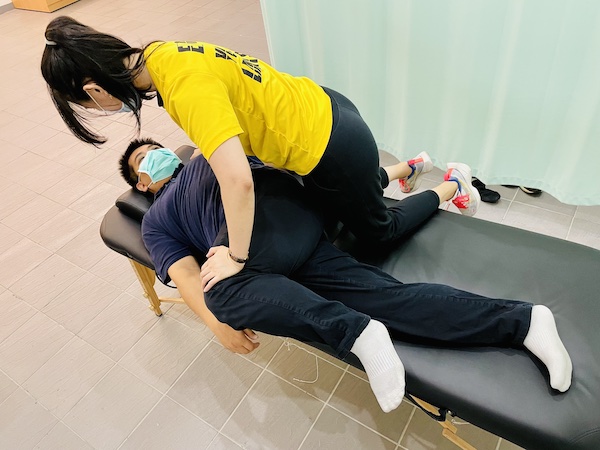 先讓對方躺平,若按摩床的面積不夠大,可採雙腿交叉姿勢,在拉伸右腳同時,固定另一編的肩膀,做出轉體動作。這個部分除了腰部之外,大腿外側跟臀部都會有一定程度的伸展效果。