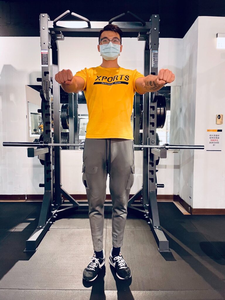首先以站姿開始進行這個動作。當你伸出手臂時,許多人會不自覺地聳起肩膀、夾緊背部,並挺胸。這樣做的結果是肘關節無法完全伸直,可能會有一些微彎。儘管如此,不要擔心,因為我們只需要維持這樣的曲度,並不需要完全打直。接著,讓手掌朝前伸出,另一隻手則輕輕按住手掌旁邊的四個手指,而不是單獨壓住某一根手指或者太靠近手掌。輕輕按住手指後,再將肩膀下壓、手肘微彎,然後繼續往前伸出手臂。這樣做的效果是拉伸二頭肌和前臂肌肉的肱橈肌。