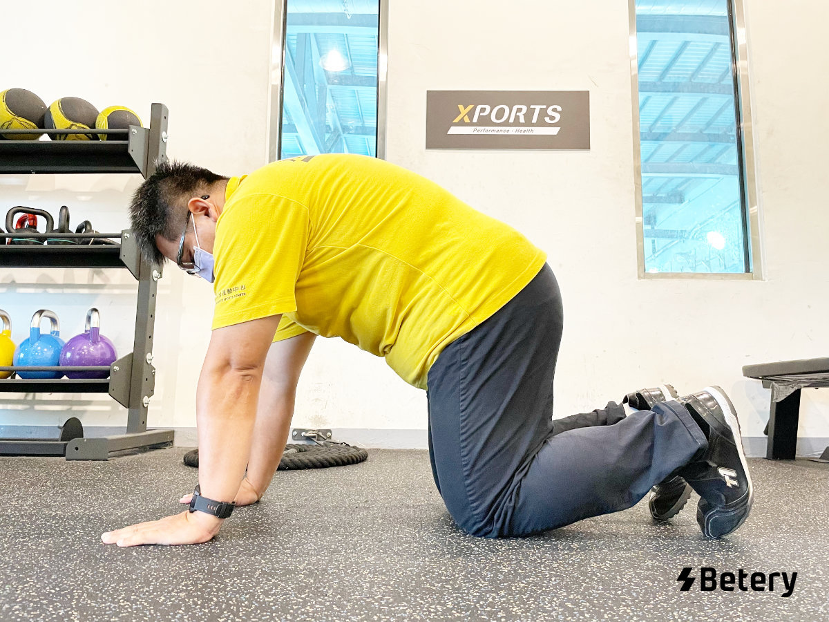 採取類瑜珈四足跪姿,身體往後拉撐,這時肩胛骨會往外擴張,背部的大小菱形肌也會同步伸展。