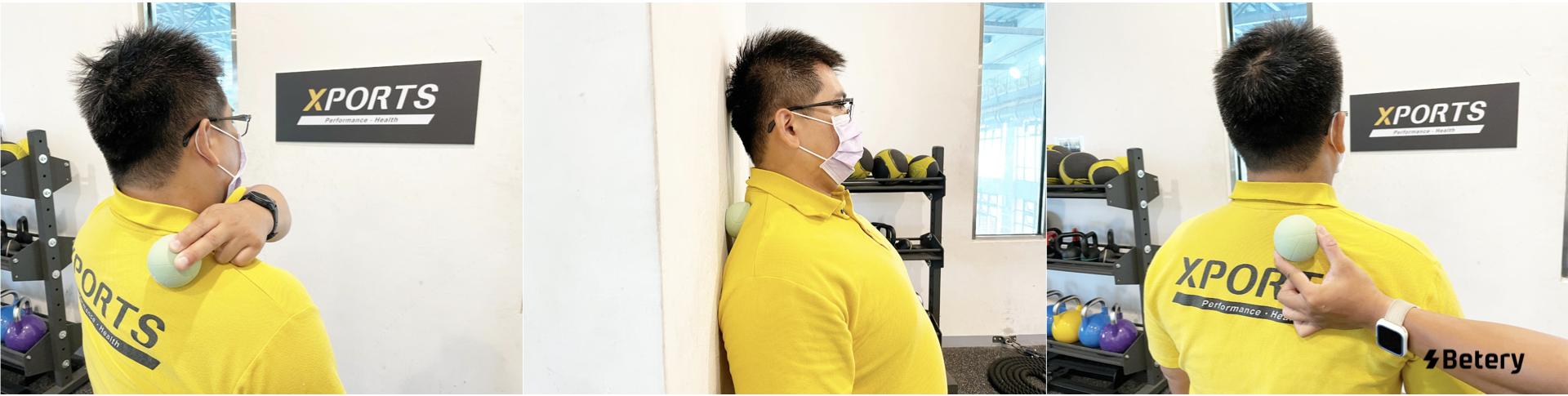 首先提肩胛肌位於脖子下緣,運用手持按摩球或高爾夫球來按壓激痛點,感受痠痛時再加碼聳肩動作讓肌肉收縮,藉此刺激神經受器來達到放鬆效果。
