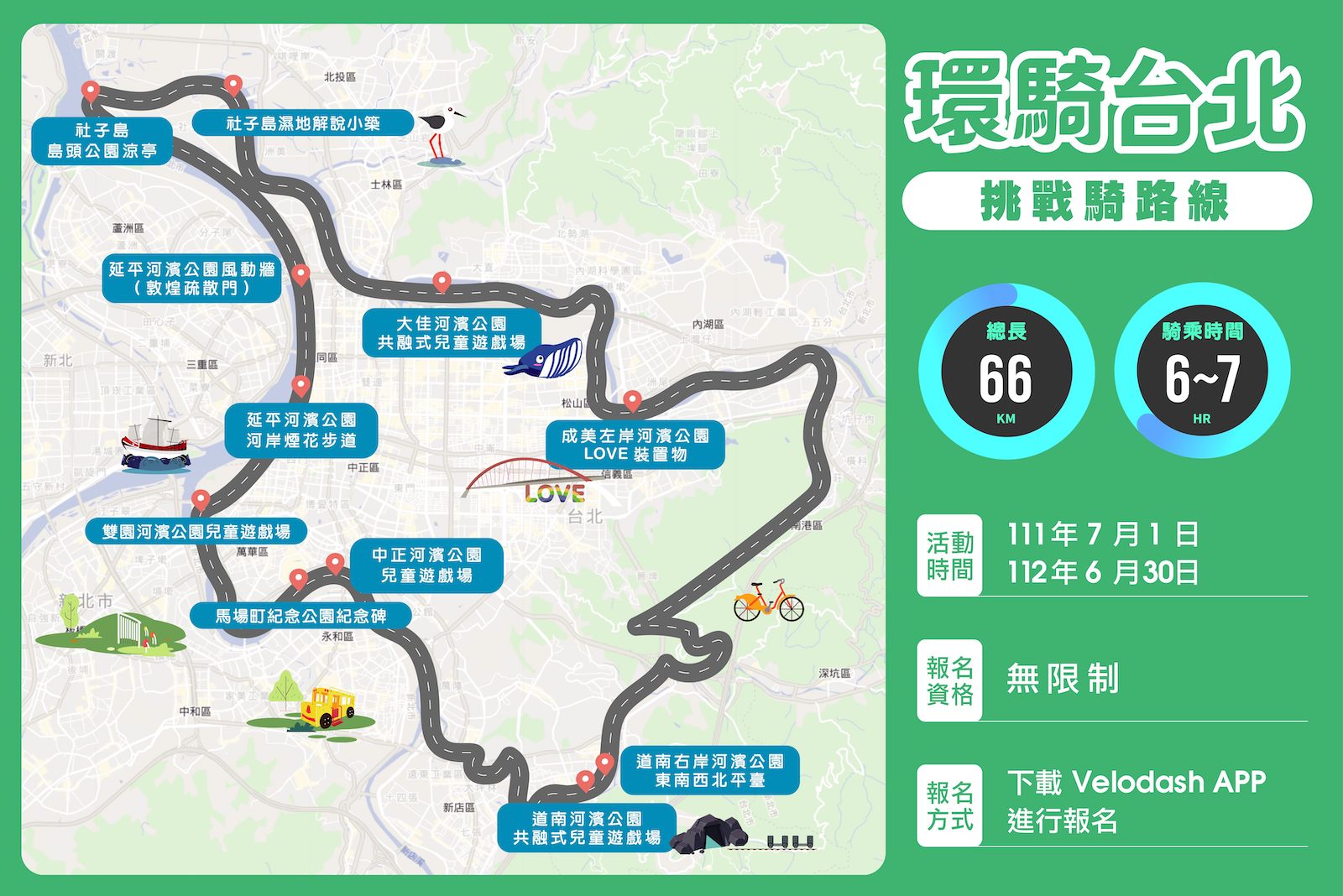 - 參加資格:不設限,參加者需自行準備可 GPS 定位及上網功能之智慧型手機,限以 Velodash 飛騎 APP 報名,並全程以 Velodash飛騎 APP 紀錄自行車騎乘軌跡。