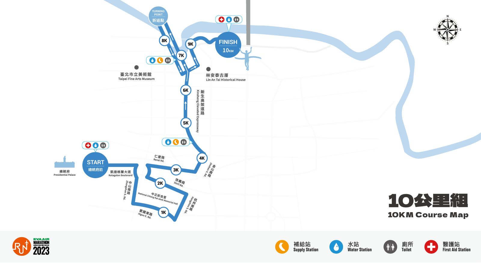 - 全馬、半馬與 10 公里組:台北市總統府前廣場