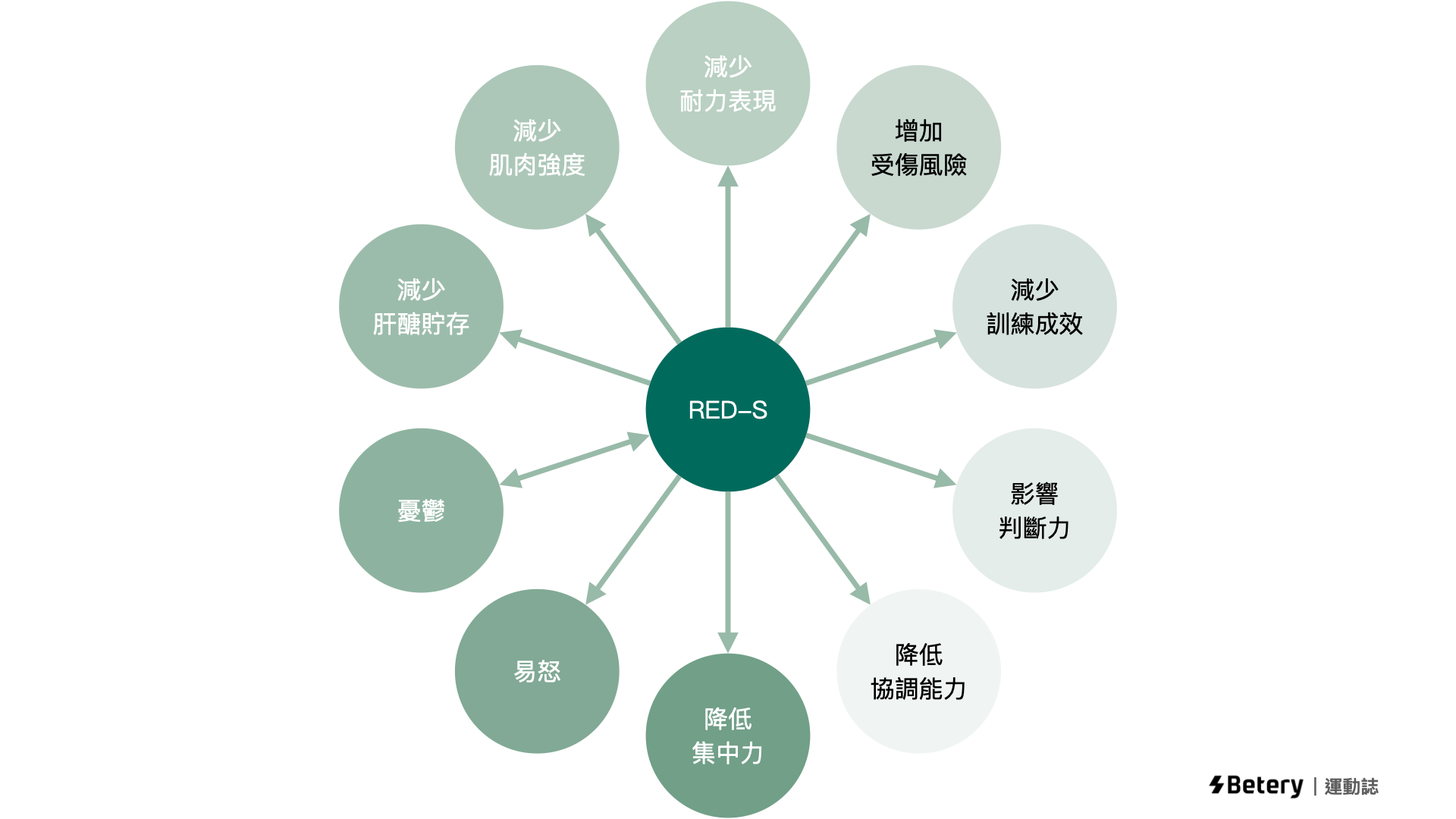 2014 年國際奧委會給出了一個專有名詞 — 運動相對能量不足,英文 relative energy deficiency in sport,縮寫 RED-S。如果一位運動員長期處在 LEA 的狀態,就會發展成 RED-S,給運動表現的影響如下: