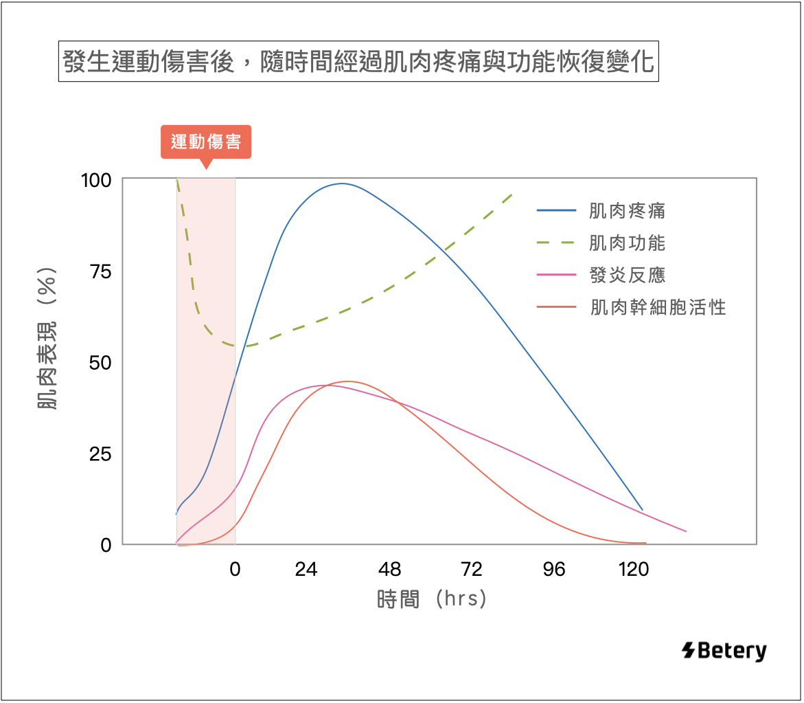 上圖是運動傷害開始之後,身上肌肉的狀況、發炎反應與肌肉幹細胞活性(說白話就是「肌肉生長」)的變化,隨著運動傷害的發生,肌肉功能開始快速下降,而發炎與疼痛也隨著功能衰退而增加,而肌肉修復則會再慢一點啟動。