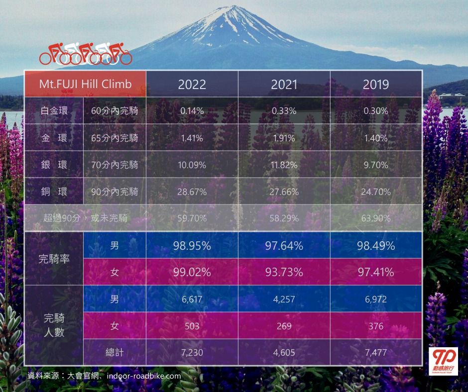 大會宣稱完賽率98%,因此完成不是問題,奪環目標以及報名才是這場賽事的難度所在。至於富士山適合哪種類型的車友呢?建議如果平常有在騎山路,或是單純騎河濱平路,偶爾練一下北部風櫃嘴、中社路的族群,基本上體能都不太會有問題,有運動習慣的假日騎士都很適合體驗看看。然而要注意的是這場比賽人數雖說為破萬等級,但名額通常都會被秒殺,故需要提前做好準備。每年台灣大約二月初就會將報名名單遞交給大會,這樣才來得及讓日本主辦方針對海外選手來做登錄作業。