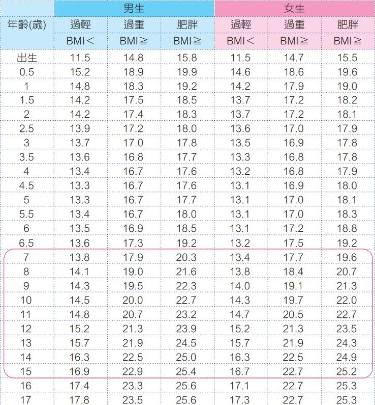 不過可能不是每個人家裡都有體脂計的看量測,這裡再提供兒童身體質量指數(BMI)的對照表,透過這張表,就能簡單的從體重狀態,判斷目前的飲食提供的能量是否足夠。