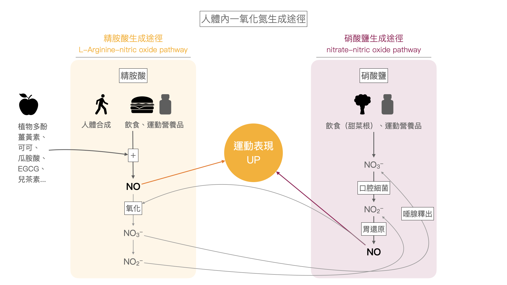 精胺酸經 NO 合成酶(NO synthase, NOS)作用生成 NO,當中有些會直接拿去參與代謝;沒用到的,繼續氧化成硝酸(NO3-)與亞硝酸(NO2-),而這兩者有機會再從唾腺釋出,經過口腔裡的細菌轉換和胃的酸性環境還原,又再產出 NO。