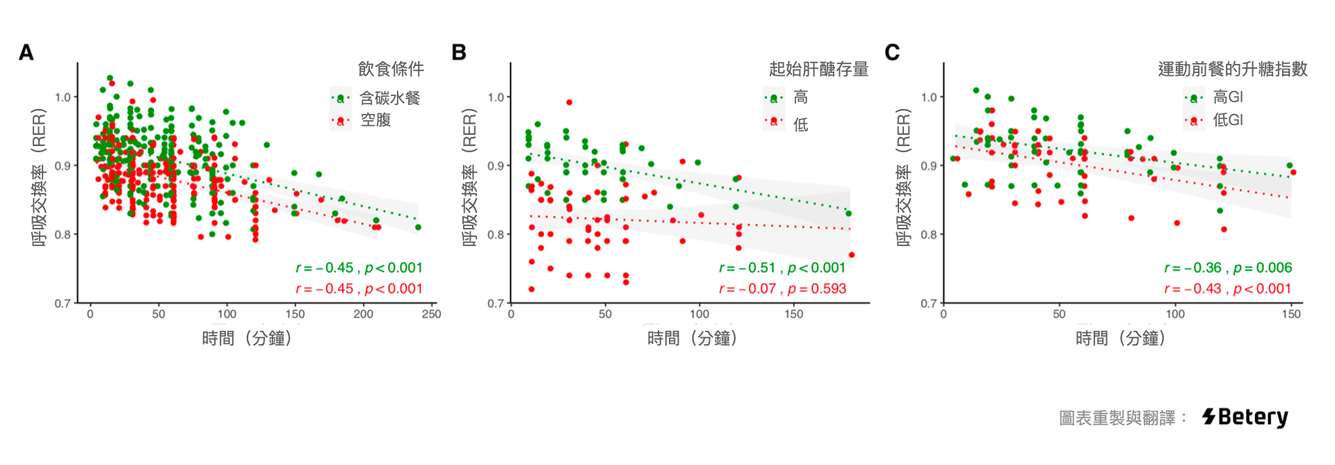 只看圖裡的點線,綠色是活動前吃含碳水的餐,紅色是空腹狀態下運動。從 A 圖可以看出有吃運動餐的話,整個運動期間,RER 都比空腹運動高。