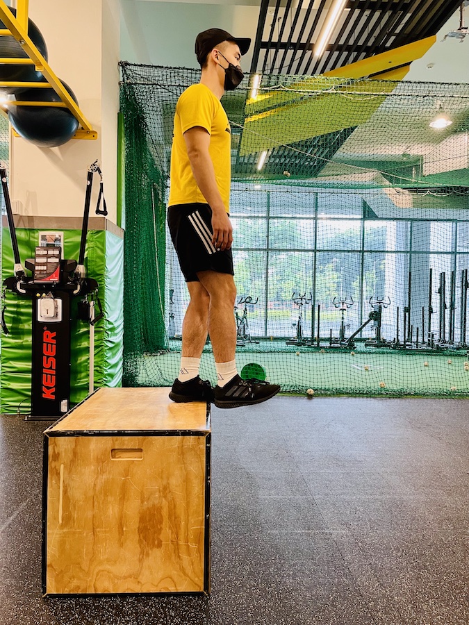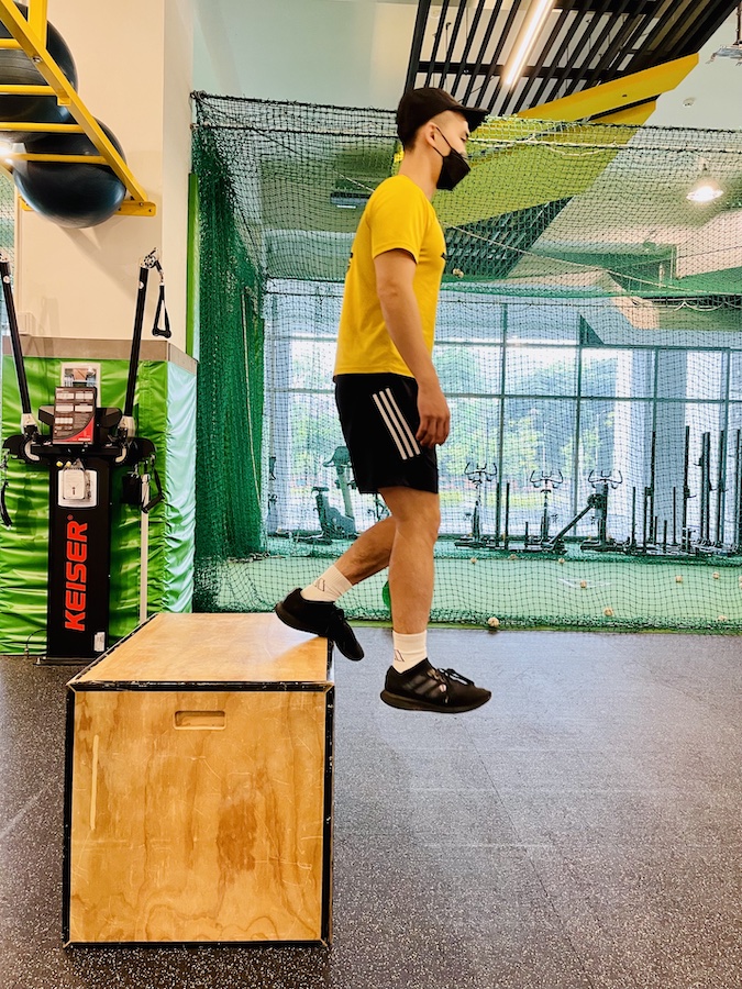 等到身體肌群熟悉後,便開始逐步進階成 <雙腳下/單腳落地>、<單腳下/單腳落地> 這類強調上肢核心控制及下肢離心穩定的動作。